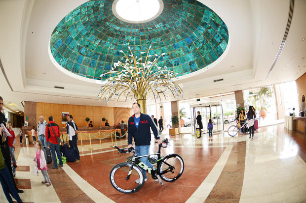 Israman entrant enters the lobby of the Isrotel Royal Garden Hotel.