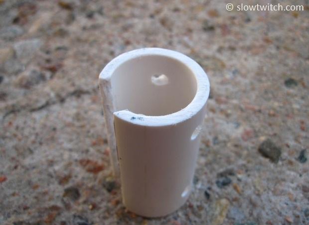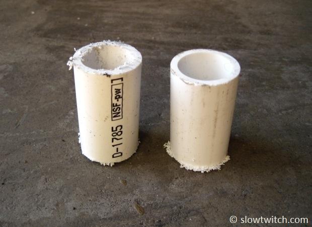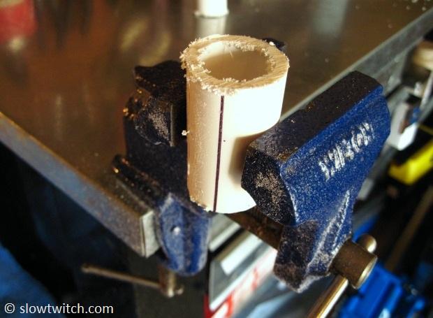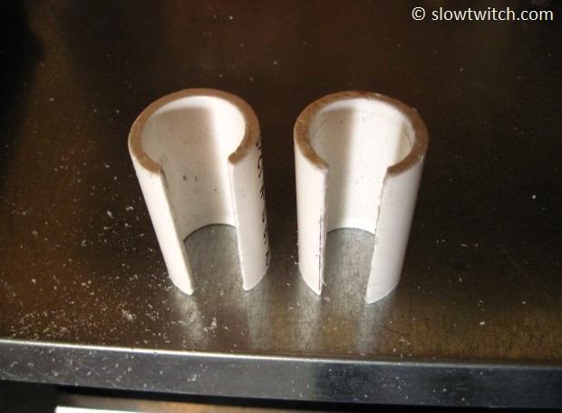 To begin, you’ll need some PVC pipe. I’m using the same 32mm outside diameter tubing that I used for the aerobar accessory mount (most common round posts range from 27 to 35mm in diameter). You can cut the pipe as long or short as you need; I found about 7cm to be sufficient.