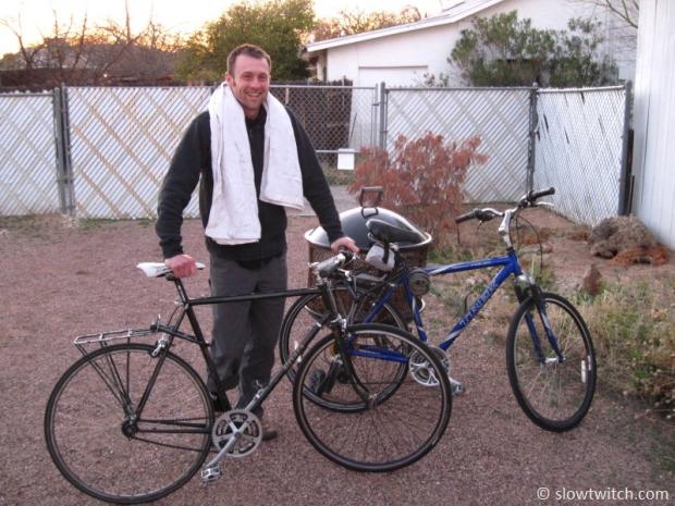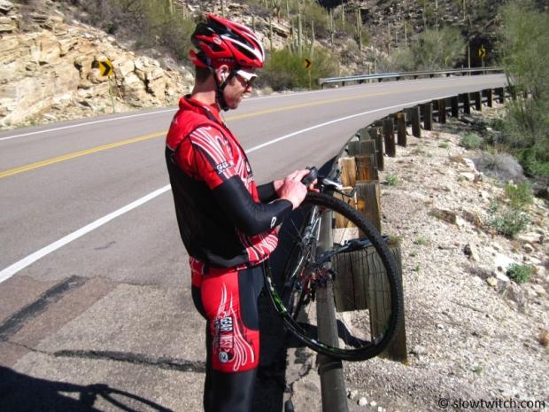 Tuesday brought drier conditions. David prepares to roll out for a ride with Gear West Bike and Triathlon owner, Kevin O’Connor. They would eventually ride for 8 hours, to the snowy top of Mt Lemmon.