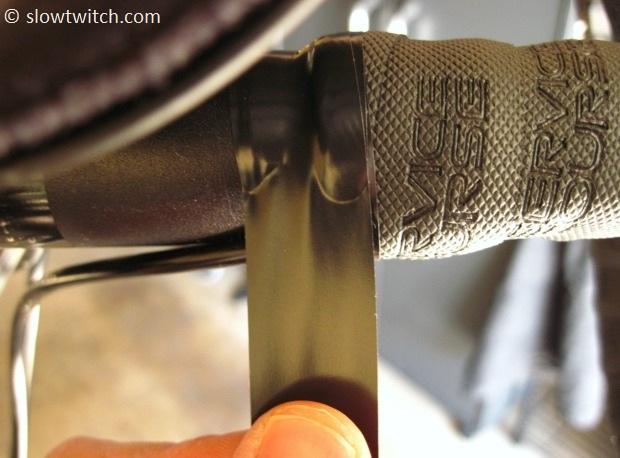 The photo above illustrates exactly why we used that small segment of tape behind the hood. Notice the V-shaped intersection of the tape wraps – if we didn’t have the piece of tape behind it, there would be a little triangle of exposed bar once we finish and roll the hoods back. It is sometimes possible forego the extra tape and avoid exposed bar, but it really depends on the bar shape, hood style, and how lucky you get.