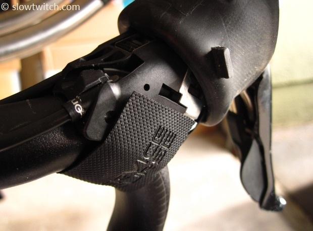 In the photo above, you’ll notice that there is a rectangular rubber protrusion on the back side of the hood. You may also notice that there’s a similar size cutout in the shifter body. You want these two to cozy up with each other. Different brand shifters have different sizes and shapes of cutouts, but the intent is the same – to hold the rubber hood in place. The important point for this demo is that you don’t cover up these holes with bar tape. My small segment of tape ended up at 7cm; you want it as long as possible, without covering up any holes.