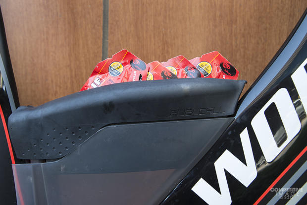 The FuelCell on the Shiv of Conrad is filled among other things with Clif products. But no, it wasn't overflowing, we were just curious to see what he had.