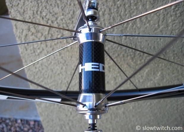 Hed makes the wise (and costly) decision to use the super quality DT Swiss Pro-lock aluminum spoke nipples. They have a pre-applied thread locking compound that works very well, and they can be trued with a 5.5mm hex driver. I’ve also found that they resist corrosion better than other aluminum nipples. Steve Hed tells me that they add significant cost to the wheels, but he simply can’t feel good about using anything else.