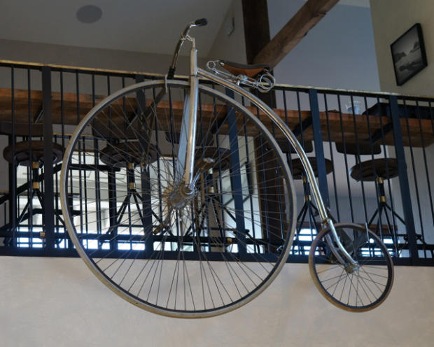 A penny farthing is the highlight of a bike collection hanging from the rafters.
