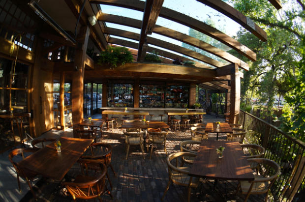 The patio is adjacent to the coffee bar, a full bar, the restaurtant, and you can watch SRAM XX1 hung on your Moots hardtail.