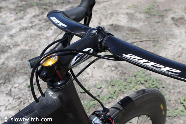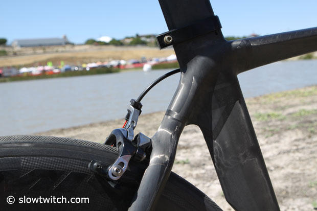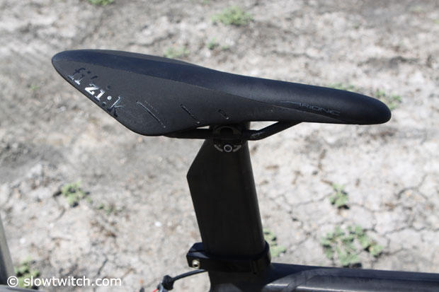 A carbon braided Fizik Arione on top of the carbon aero seatpost.