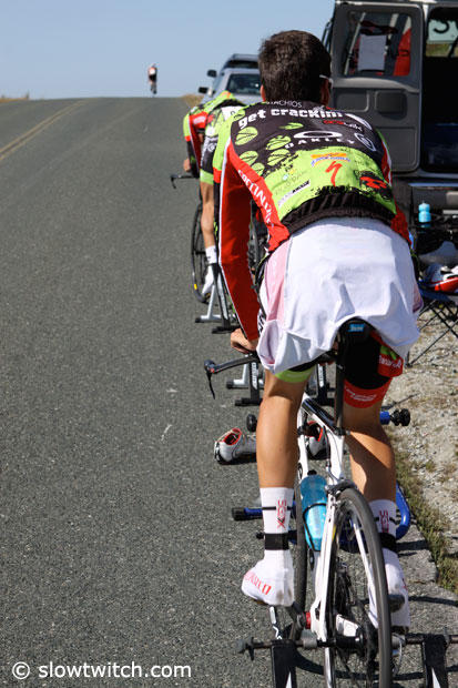 The women of Team Exergy were warming up on their road bikes in a bit of shade.