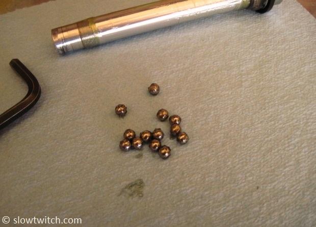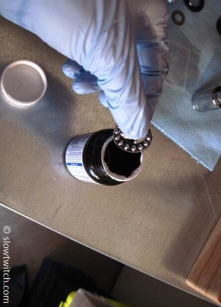 The layer of grease you put down first will help keep the bearings in place so you don’t lose one.