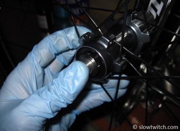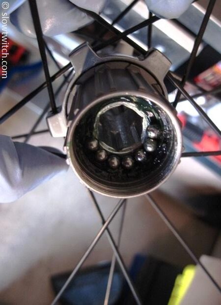 Now it is time to reinstall the ball bearings. Remove them from the solvent bath and wipe them off with a clean rag. I install the drive side bearings first, so the non-drive side retainer has extra time to dry out. Put down a layer of grease in the freehub cone, and start installing your bearings one-by-one: