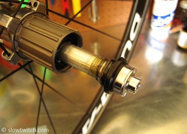 At this point, we’re almost done. We have clean bearings, fresh grease, and a super-slick freehub. Now comes the subjective part of setting the preload. First, thread your cone back on to the axle. What we’re shooting for is a situation of “no play” when the wheel is clamped into the frame. With Shimano hubs (but not all hubs), the tightness of the quick release affects the bearing preload. The tighter the quick release, the tighter the preload. That being the case, I shoot for a TINY bit of play when the wheel is out of the bike, and “no play” when the wheel is clamped in with an average QR tightness.