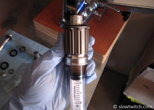 This tool must be used with the Morningstar ‘freehub soup’ grease, which comes in a special syringe. The syringe threads straight into the tool, and you press the tool into your freehub: