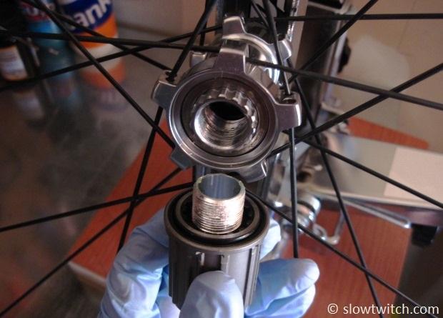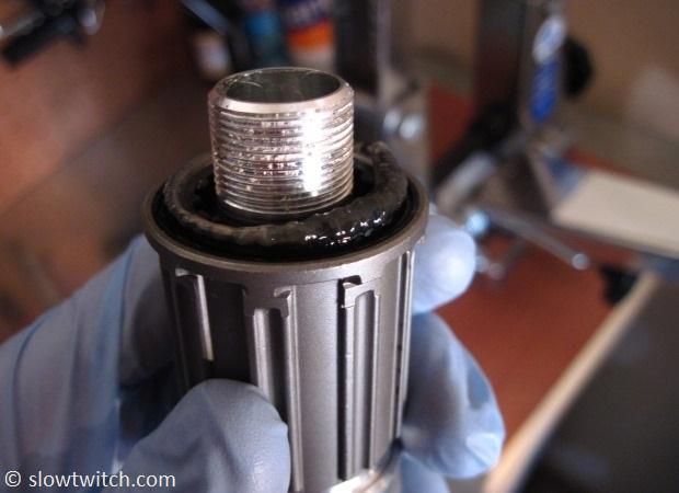 Next, put a small amount of grease on the freehub threads and splines, and thread the freehub back on (not pictured). I don’t know the exact torque spec, but it should be pretty snug; you can gauge that based on how difficult it was to remove in the first place.