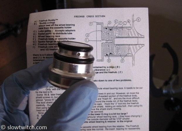 Make double sure that the tool is pressed all the way in – firmly. The two o-rings in the tool trap grease into a channel, so that the grease can be forced through a tiny space in the freehub. All we’re doing is purging with new grease – similar to the regular service you must do to Speedplay pedals. I’ve seen some people use this tool to first push solvent through the freehub, then water, and finally grease. I’m personally not a fan of this procedure because it can trap solvent or water inside the freehub (which is NOT good news for the grease you’re eventually going to put in).