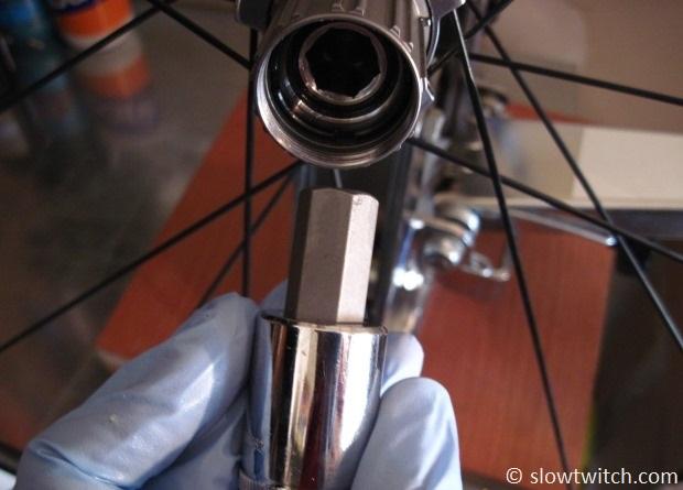 I’ve found that the best way to do this is trial-and-error. For older-style Shimano hubs, I have a neat tool that allows you to perfect this with the wheel out of the bike, but that’s for another demo. With this 7900 hub, I thread the cone down little by little, and push the axle back and forth (left-to-right) with my left and right hands.
