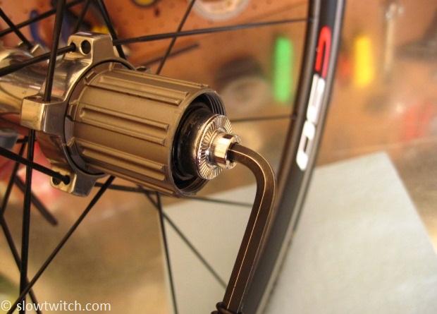 The entire drive mechanism is housed inside the freehub – loose bearings, pawls, grease, and the whole nine yards. First, we need to remove it from the hub. This requires a big-boy 14mm allen wrench. My set of 3/8” drive allen sockets only went up to 10mm, so I bought 1/2" drive 12 and 14mm separately.