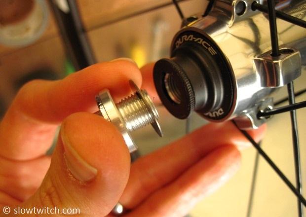 Note that this adjuster is keyed. Also note that the axle in the background has a similar shape. When you line the two flat parts up, the plastic adjuster goes all the way on the axle. That flat portion keeps everything locked together, so you cannot adjust the hub preload any longer.