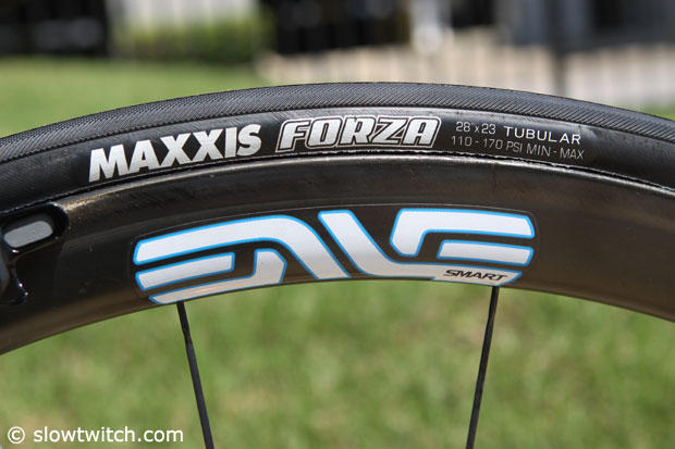 Enve Smart 3/4 tubulars and Maxxis Forza tires.