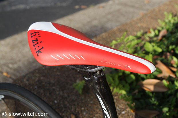 A Fizik Arione CX saddle in bright red perched on a Zipp post is trusted for several hours each day.