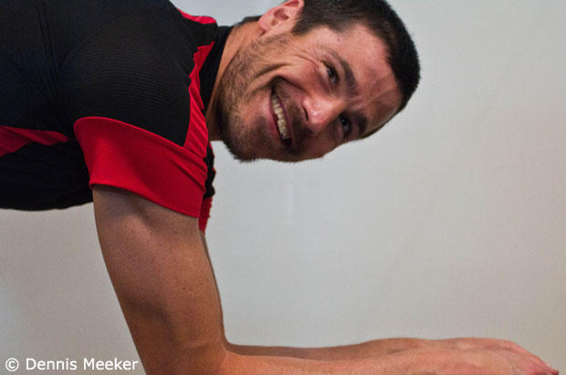 Placing markers on Andy's upper body. To talk numbers, Andy's back angle was 25 degrees (measured with the retul motion capture system) when he came in this winter (greater trochantor-acromium-horizon). He's now down to 19-20 degrees depending on his posture. Something to note – his hip angle did not change.