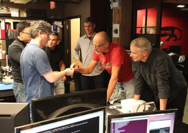 A Jet is being demo'd by a press member in Recon's headquarters in Vancouver, BC.