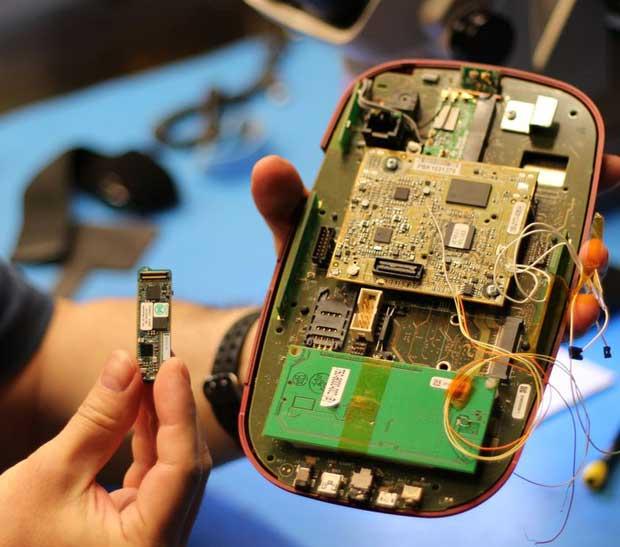 That’s the brain and the internal organs. The eye is an active matrix liquid crystal display (AMLCD) made by Massachusetts-based Kopin. The display is tiny, and rectangular, and has a 6 micron pixel size, which means the display packs a lot of pixels onto a small screen. If we can use pixels-per-inch (PPI) as a gauge for determining sharpness based on pixel density, you’re reading a computer monitor, if you’re at a typical desktop, that has a pixel density of about a hundred PPI. The monitor on a good notebook computer, like a MacBook, displays more than 200 PPI. Your iPhone? More than 300 PPI. The display on the Recon Jet? About 2400 PPI. But that’s what you need if you want to pack enough pixels into a tiny display so that you could watch a movie. We’ll talk more about the applications for a display like this in a moment.