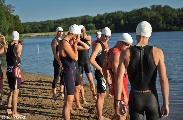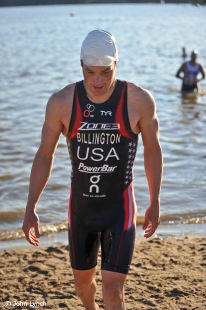 Greg Billington charges into T1 after an race leading 18:40 swim.