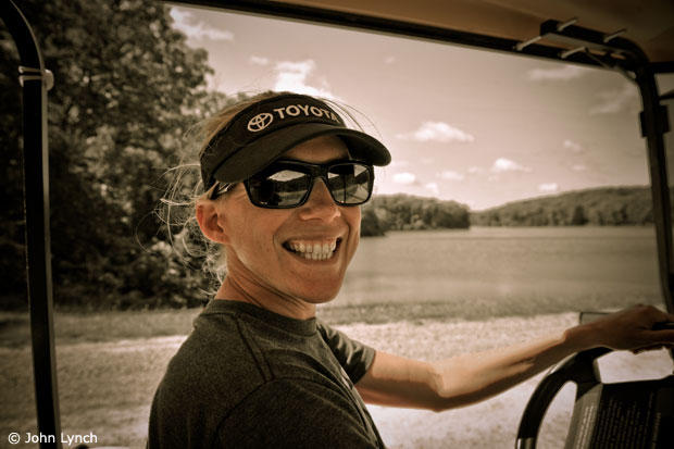 A clearly happy Sarah Haskins enjoyed her golf cart spectating perspective.