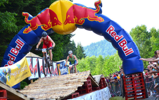 Nico Lebrun leads Francois Carloni over the Red Bull ramp.
