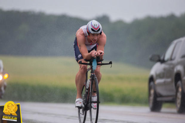 Dustin McLarty plows through the rain here after exiting the opening swim a minute ahead of the pack.
