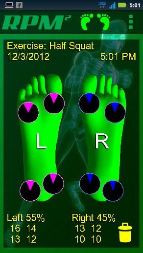 The half squat tells you the pressure exerted on each ‘quadrant’ of your foot, measured by the four pressure sensors. The output gives percentage, so you’re comparing your feet relative to each other (both feet add up to 100 percent).