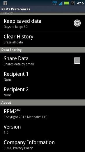 Regardless of what you want to do with the data or who you want to share it with, RPM2 does make that sharing easy. You have the option to auto-email a PDF report of your exercises to two people, as seen on the menu screen: