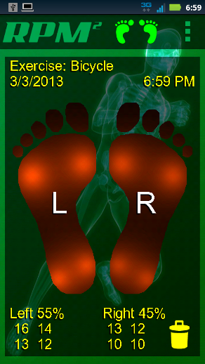 The cycling option operates similar to running, allowing for a six hour ride time, and taking five random samples. The output gives you pressure in the four quadrants of each foot: