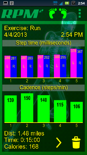 The final main mode for RPM2 is dynamic movement. For the standard model, that includes a 100 meter dash, or a longer run up to 4 hours. The long run option takes five random 10-second samples during your run, telling you the average step time and cadence for each segment: