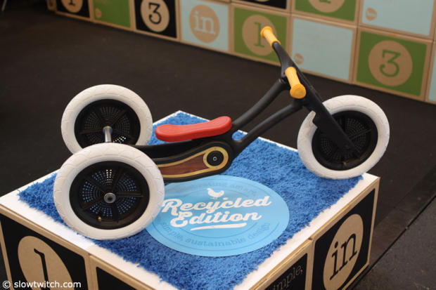 This very cool tricycle from Wishbone Design is made from recycled rugs like the one below it.