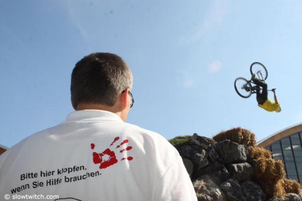 The German Red Cross first aid person reminds us to knock should we need help, but if that guy in mid air crashes he might not be able to knock.