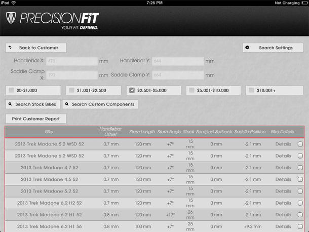 That’s the process. That’s how you do it. That’s the “cattle” method done right. The problem with the all-inclusive methods of complete bike solutions is that they cast too wide a net or, alternatively, they miss obvious solutions. God bless these all-inclusive methods. The problem is, if you’re a Trek dealer and you see the output pictured here, there are too many options and most of them are just plain wrong. It’s going to take Trek awhile to wrestle this system to the ground, and I recommend that at the very least they establish parameters for the front end. For somebody riding a bike around 54cm, maybe a stem no longer than 110mm, no shorter than 90mm, pitch no steeper than 0°, spacers no less than 10mm no greater than 45mm. Or whatever. Let the dealer establish search parameters. That'll grant a much narrower list of possible bikes, and all of them good options.