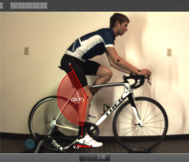 By the way, before I start getting smart-alecky comments on our Facebook comment utility below, of course the rider pictured here (I think in the top pic it's Andy Schleck, further down it's Lindsey Corbin, don't know who's in this motion capture pic) is certainly not scribing a 36° knee angle. He's scribing a 144° angle most likely, which is the included knee angle. Yes, the image indicates it's the included knee angle measured. But I'm guessing (I didn't ask) that the output is the exterior knee angle, which is an angle commonly used in the medical community (180 – included angle). Trek probably either ought to change way it's describing knee angle or change the way the angle is drawn.