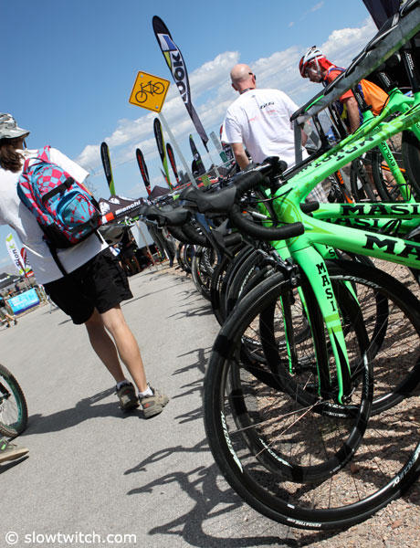 The Outdoor Demo area is set up for a variety of bikes but in all reality it is really best suited for mountain bikes. It is also allows for bike industry folks to mingle in a very casual and hot atmosphere.