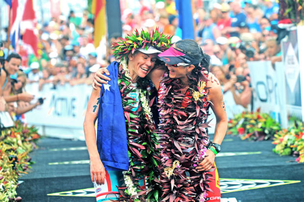 Fierce rivals on the field of play, Mirinda Carfrae and Rachel Joyce share mutual admiration and affection after their 1-2 finish.