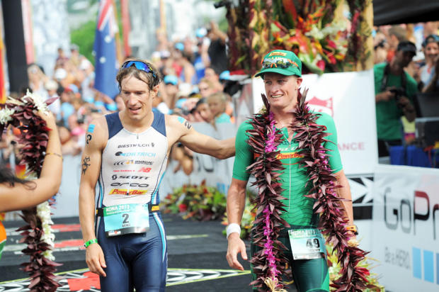 In what may be his final Kona appearance, three-time Ironman World Champion Craig Alexander, accompanied by TJ Tollakson, waves to the crowd after his 23rd place pro men's finish.