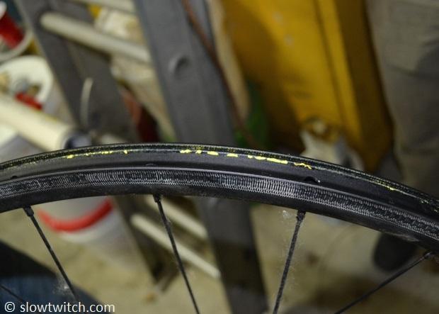 To prove it to me, Hed brought out an aluminum test wheel that had been placed in an oven and repeatedly tested at temperatures they see on the road with carbon clinchers – the yellow residue is burnt on from a clincher tire bead: