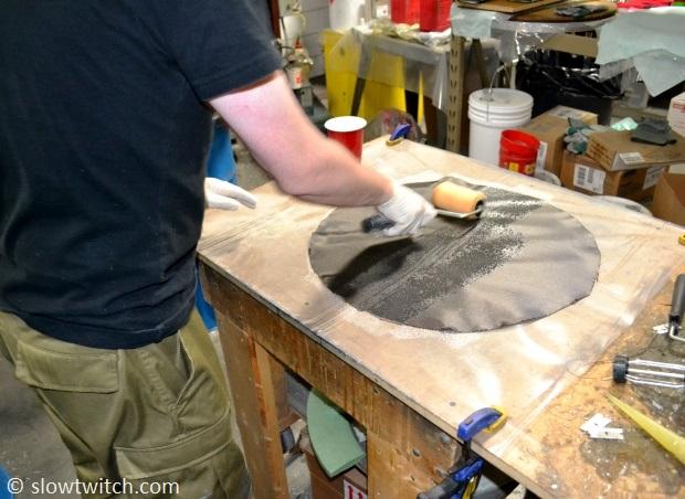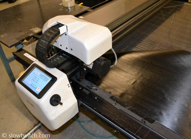 This computer controlled machine is being set up to cut out carbon segments for a rim.