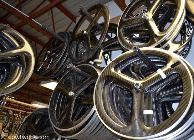 What actually takes place in each building? The main building contains offices, sales, wheel assembly, warranty, shipping, wheel decaling, QC, and small parts inventory. The second building houses engineering, warehousing, carbon cutting, aluminum rim rolling, R&D, decal printing, and the molding of all Stinger rims, Jet carbon skins, and disc wheel skins.