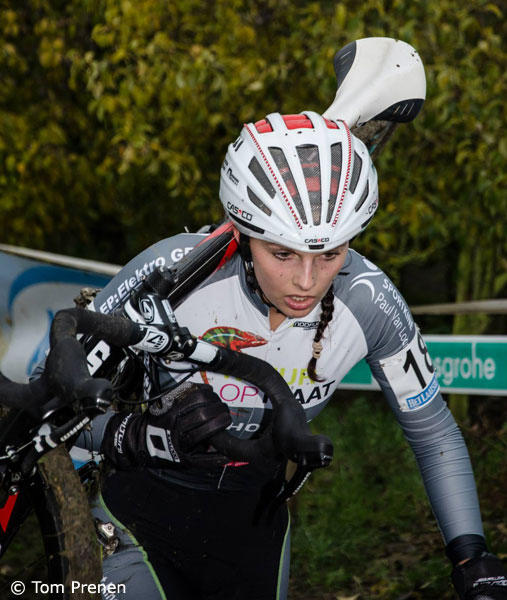 Axelle Bellaert is rounding the corner just outside of the top 10.