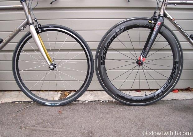 The key implication that this has is it complicates your brakes. If you train on a narrow aluminum rim and race on a wide carbon rim, you must completely change your brake setup when you change wheels. The two rim materials require different brake pads, and the width of the brake must change to accommodate the two rim widths.