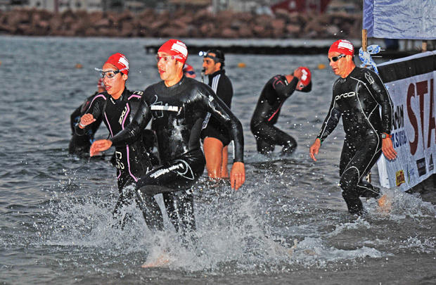 Triathlete start just before dawn at the Israman Triathlon in Eilat.