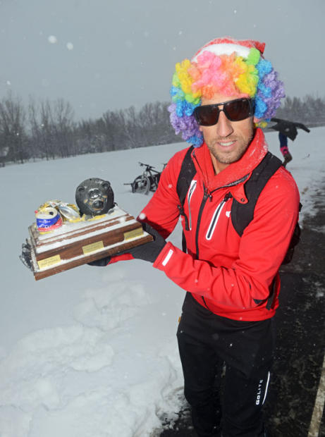 Race announcer and referee Billy Edwards displays the elegant Boulder Beer Mile trophy.