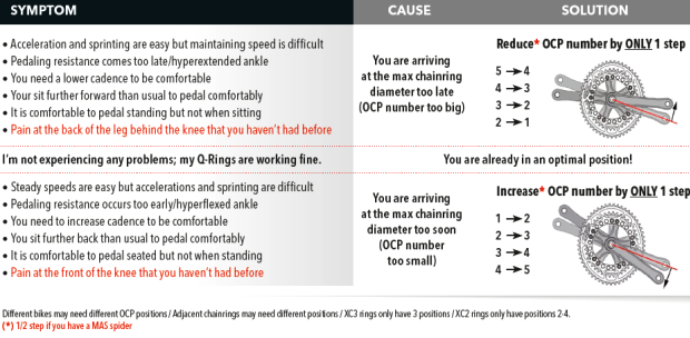 Must you run both chainrings in the same OCP number? According to Rotor, you do not have to use the same position, but using drastically different numbers could result in poor shift performance. As an example, someone might want to use position #4 for their big chainring, where they’ll have a higher probability of riding on the nose of the saddle. They might use position #3 for the small chainring, due to the tendency to ride slower and/or further back on the saddle. I tried this, but personally preferred to have the same number; it just felt better to me.