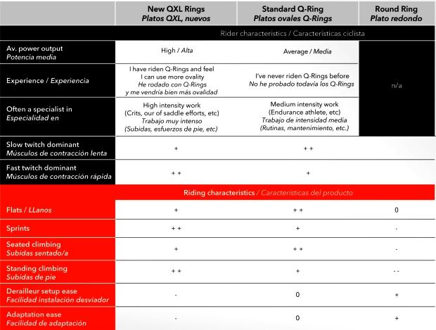 “’Ovality’ of a chainring is the major axis vs. the minor axis (round is 1.0, Q-Ring 1.10, QXL 1.16). Also, I think more important than the ovality numbers are the actual diameter in terms of tooth count: Q-Ring is a standard 53T chainring with a 10% ovality producing a maximum diameter comparable to 56T chainring, and a minimum diameter comparable to a 51T chainring. QXL is a standard 53T chainring [with a] 16% ovality, permitting a maximum diameter equal to a 57T chainring, and minimum diameter equal to a 49T chainring. Obviously a round ring is the same diameter all the way around.”