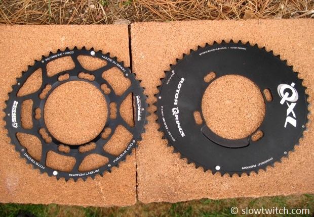 This photo shows the 50t Q-Ring laid on top of the 53t QXL: